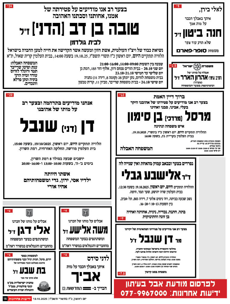 ההלוויה תתקיים היום, יום ראשון, 19/10/2025, בשעה 15:00,