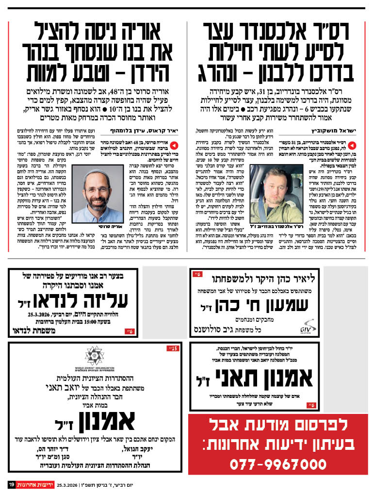 הלוויה תתקיים ביום רביעי, 25.3.2026