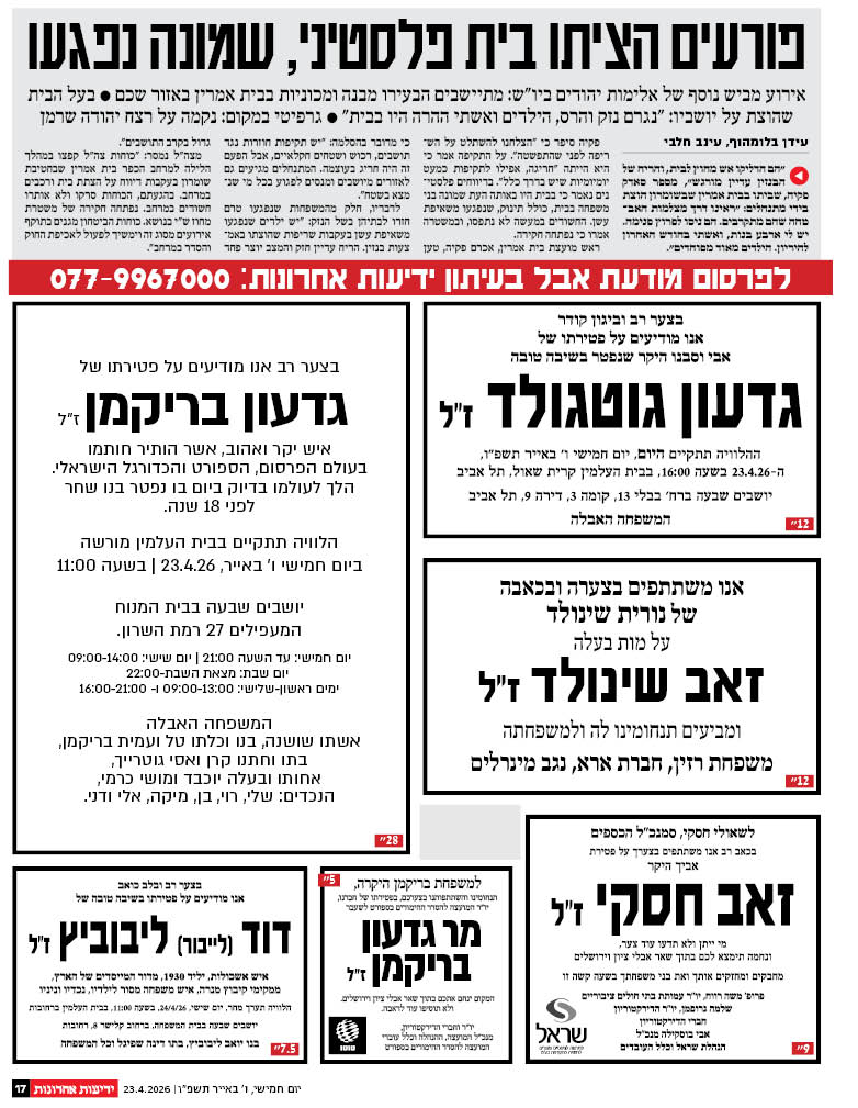 ההלוויה היום, יום חמישי, 16.4.26 בשעה 19:00 בבית העלמין החדש בחדרה