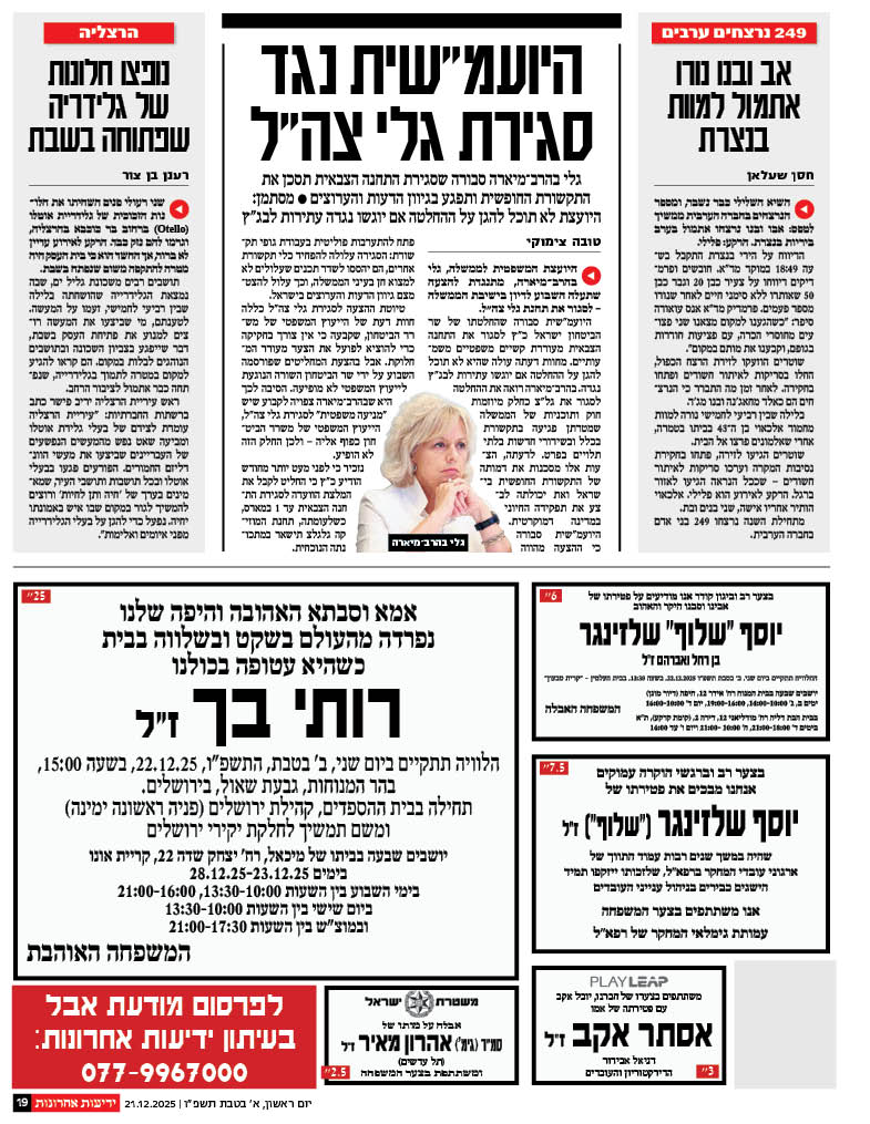 ההלוויה תתקיים ביום שלישי, 9.12.2025, י"ט בכסלו תשפ"ו,