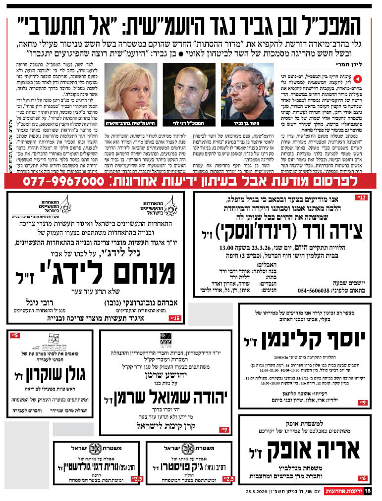 ההלוויה היום, יום שני, 23.3.26 בשעה 13:30 בחיפה – בית העלמין תל רגב (נחלת בנימין)
