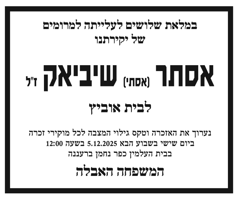 ההלוויה תתקיים ביום שני, 01.12.25, י"א בכסלו התשפ"ו בשעה 14:30