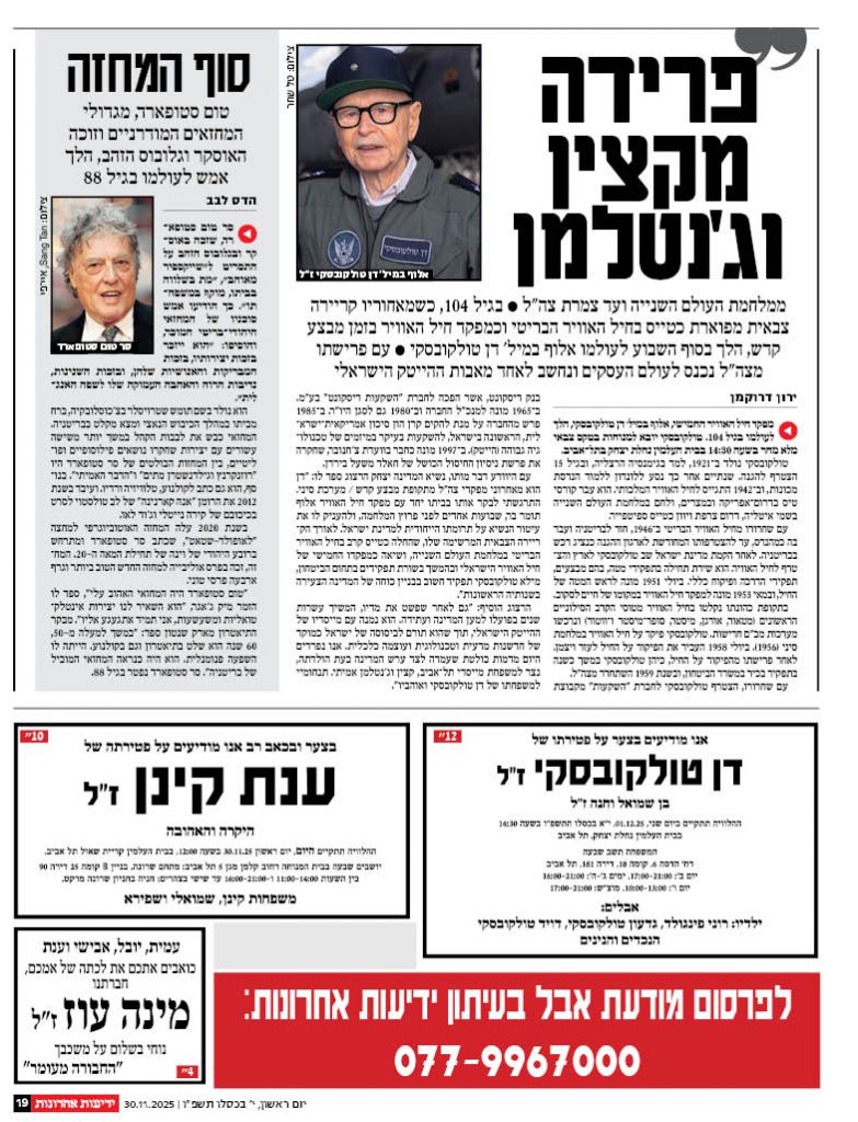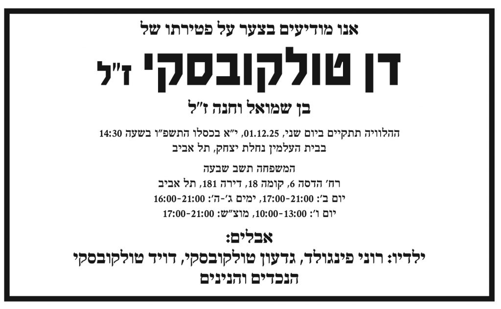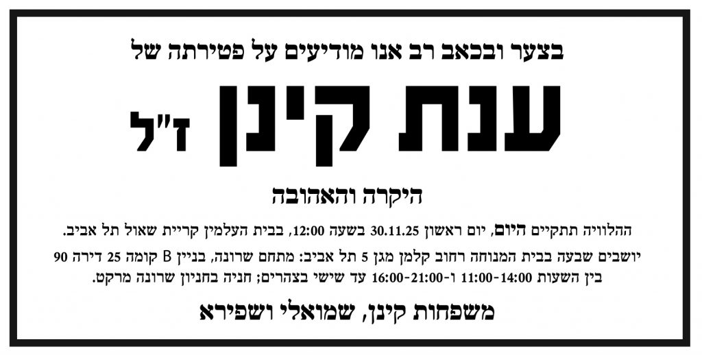 ההלוויה תתקיים היום, יום ראשון 30.11.2025 בשעה 12:00, בבית העלמין קריית שאול תל אביב.