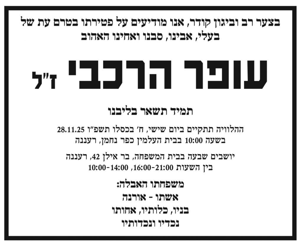 ההלוויה תתקיים ביום שישי, ח' בכסלו תשפ"ו 28.11.25