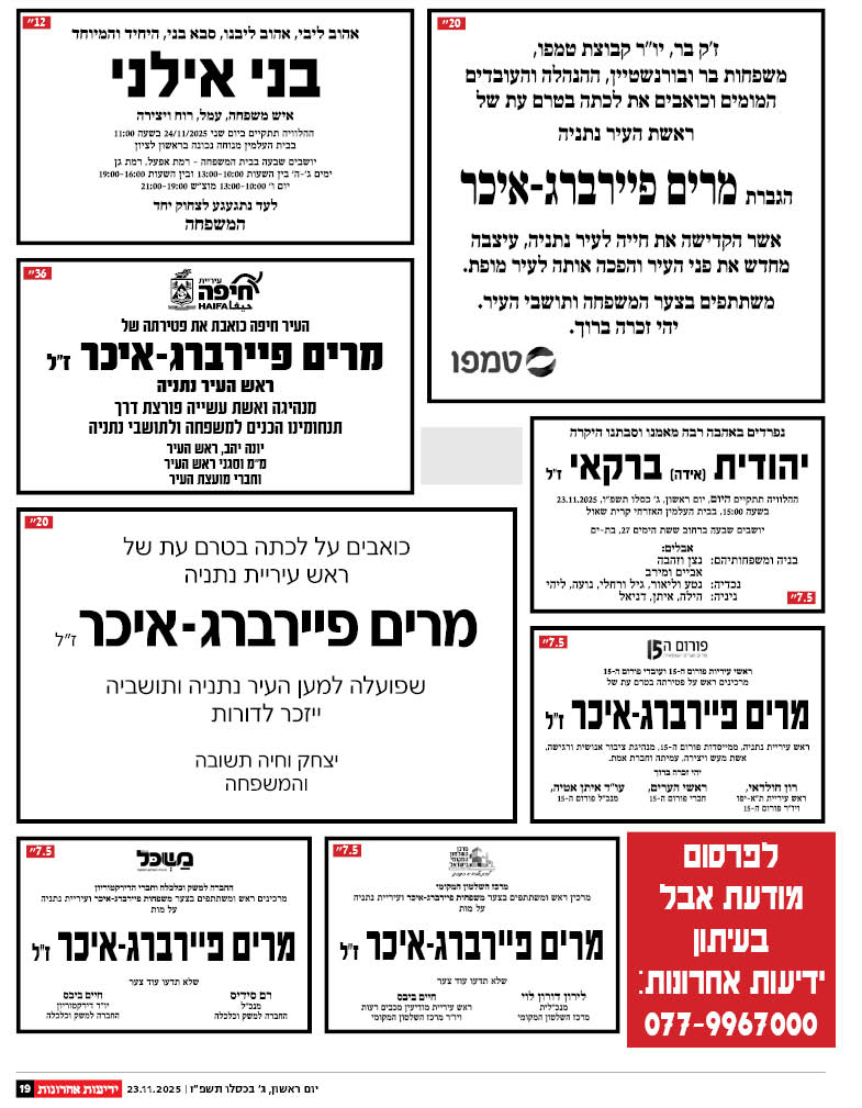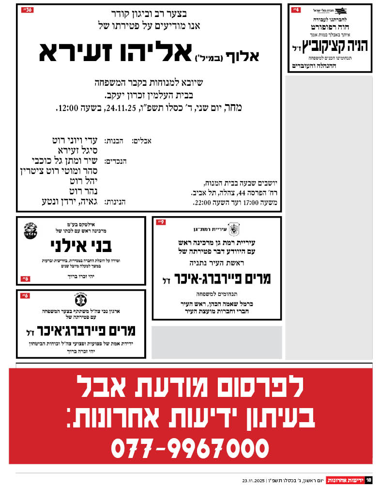 ההלוויה תתקיים היום, יום ראשון, ג' כסלו תשפ"ו, 23.11.2025