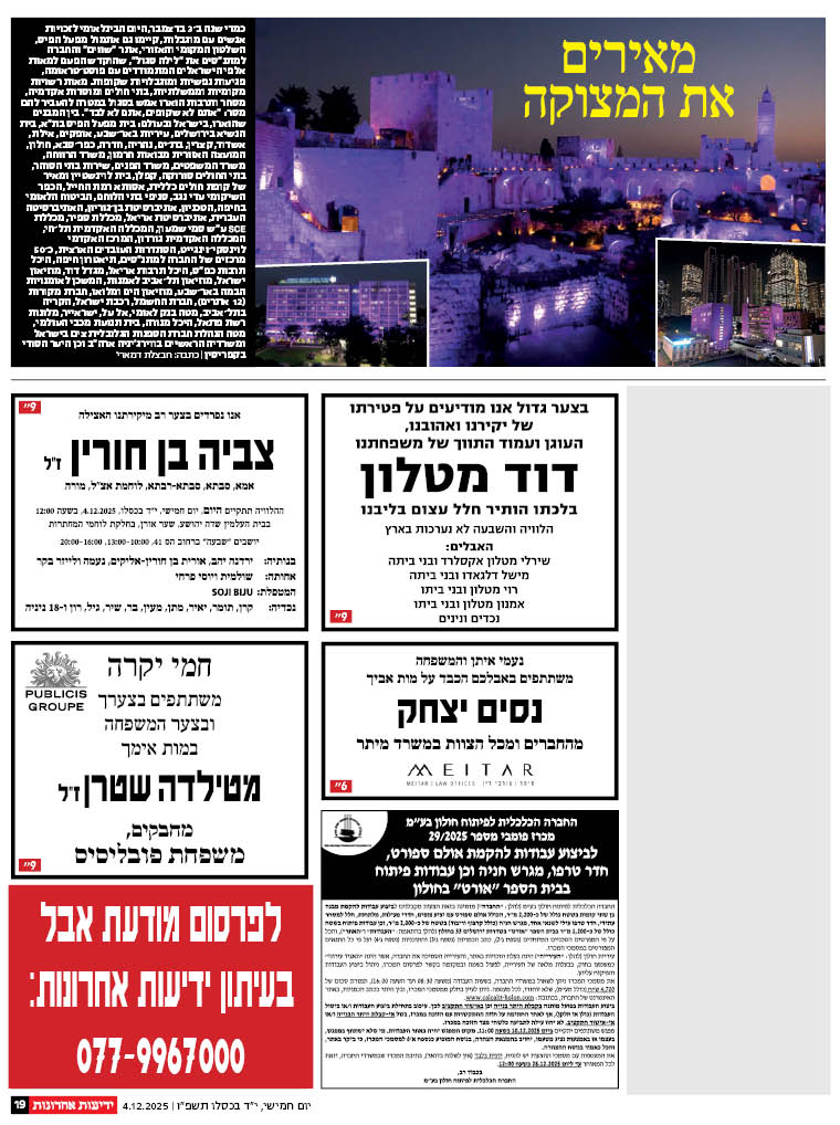ההלוויה תתקיים היום, יום חמישי, י"ד בכסלו, 4.12.2025, בשעה 12:00
