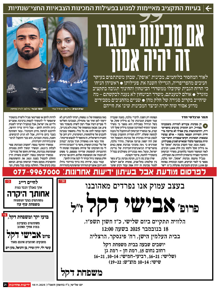 לפרסום מודעות אבל בעיתון ידיעות אחרונות חייגו 077-9967000