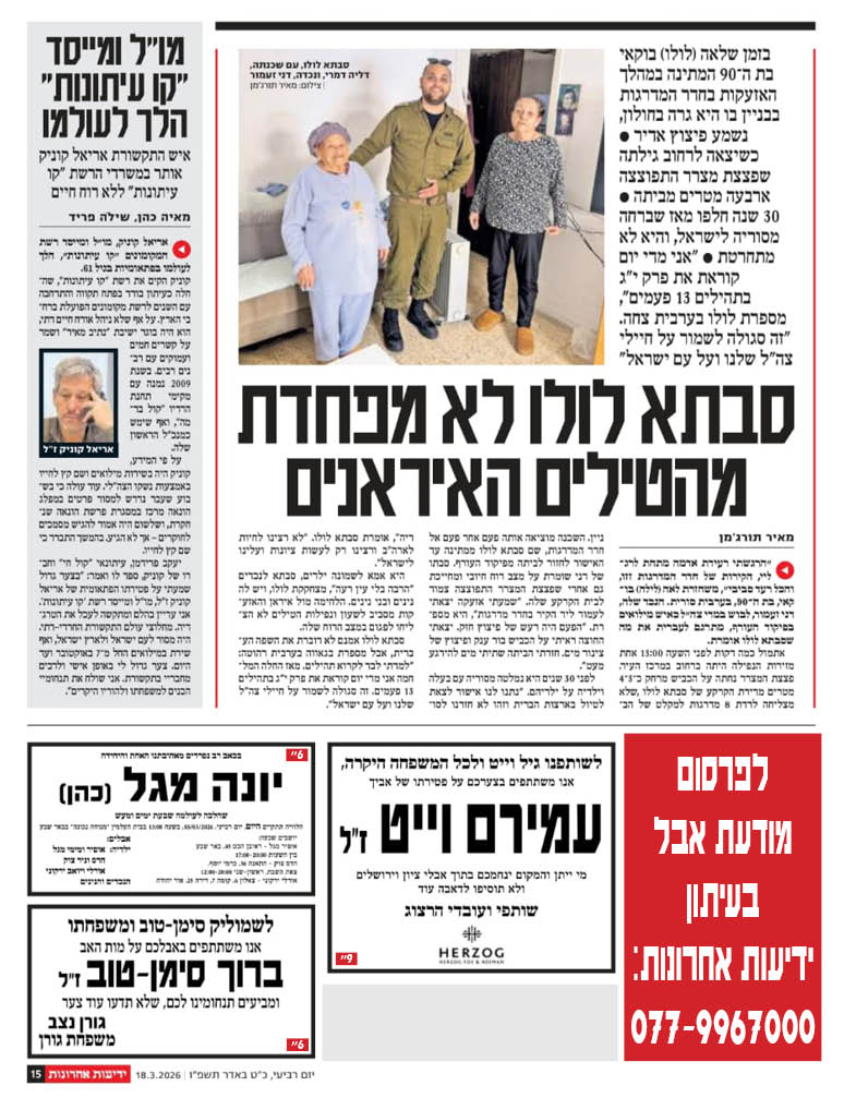 ההלוויה היום, יום שני, 16.3.26 בשעה 12:30 בחיפה – בית העלמין תל רגב (נחלת בנימין)