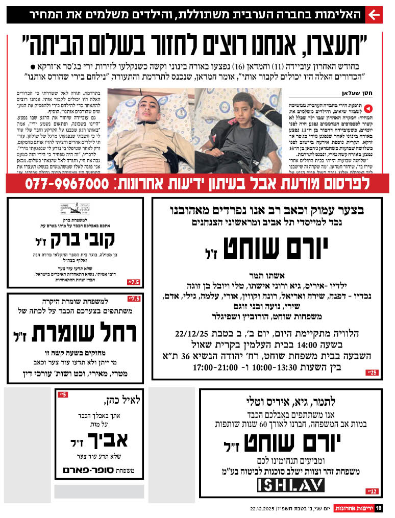 הלוויה מתקיימת היום, יום ב', ב בטבת 22/12/25