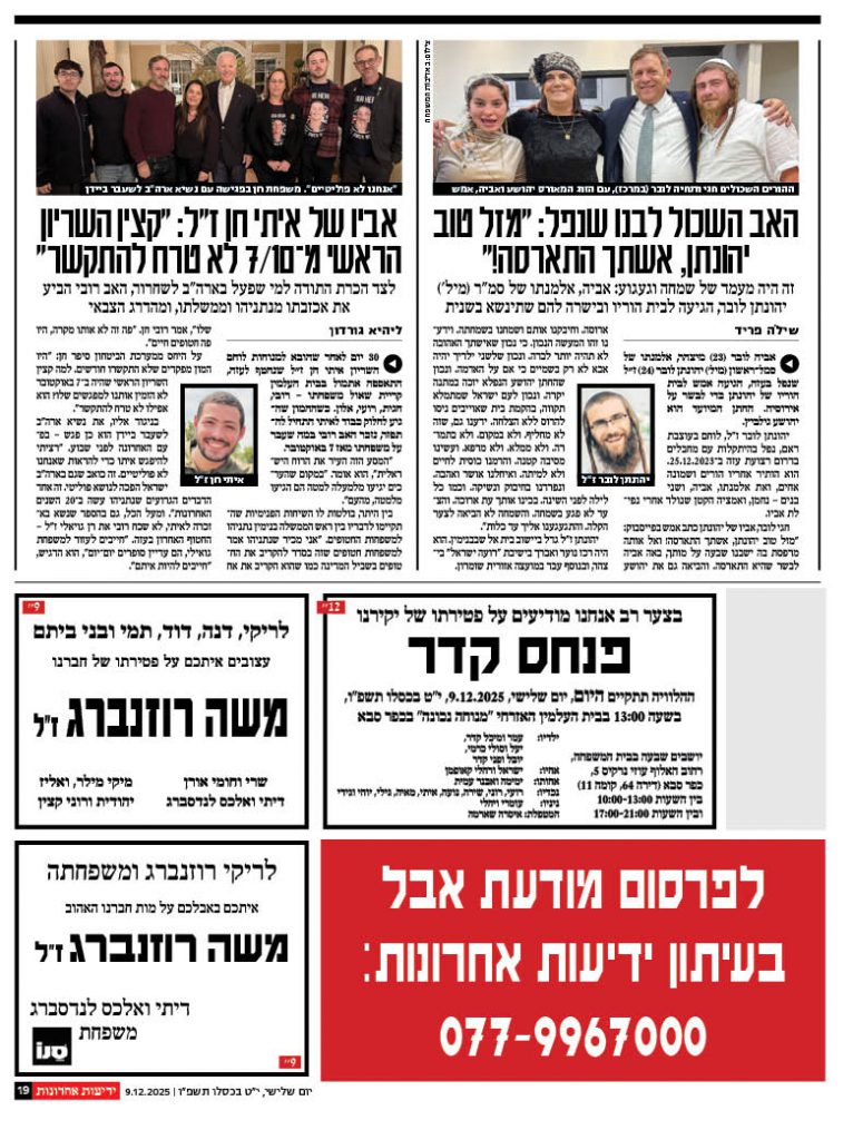 ההלוויה תתקיים ביום שלישי, 9.12.2025, י"ט בכסלו תשפ"ו,