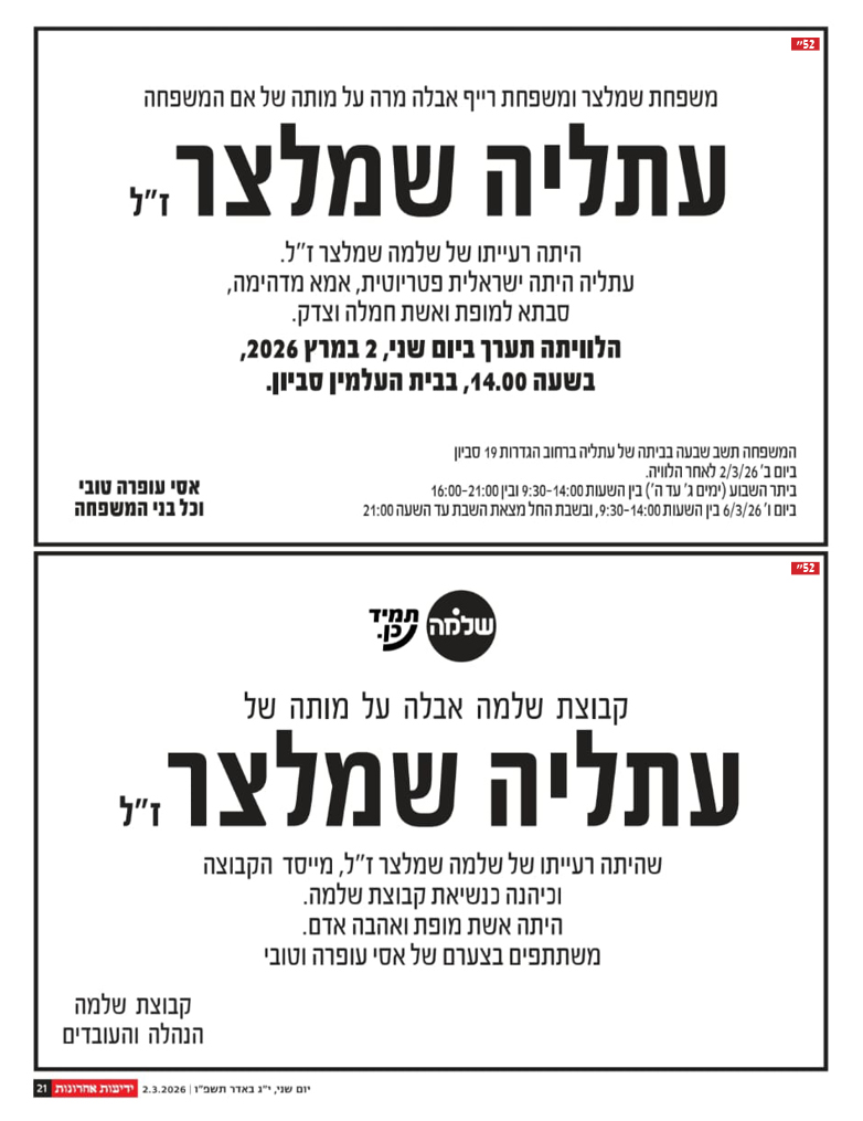 לפרסום מודעות אבל בעיתון ידיעות אחרונות חייגו 077-9967000