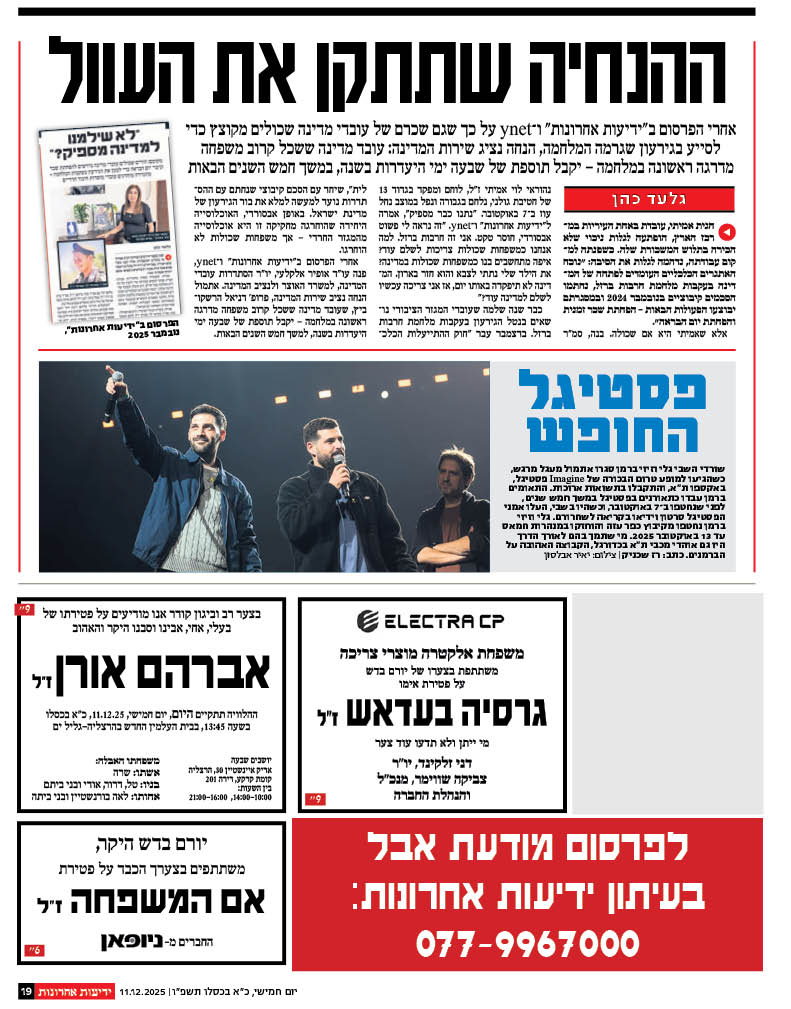 לפרסום מודעות אבל בעיתון ידיעות אחרונות חייגו 077-9967000