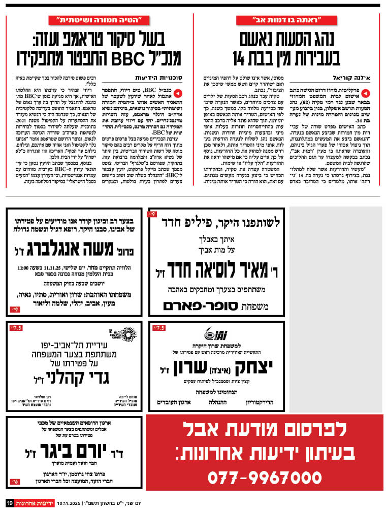 לפרסום מודעות אבל בעיתון ידיעות אחרונות חייגו 077-9967000