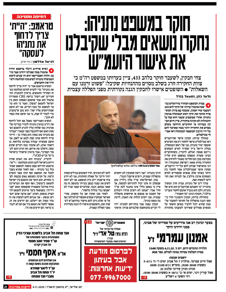 לפרסום מודעות אבל בעיתון ידיעות אחרונות חייגו 077-9967000