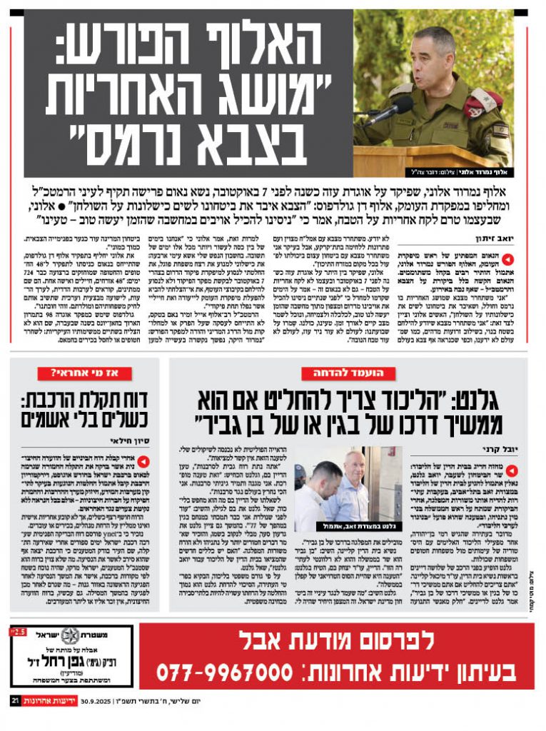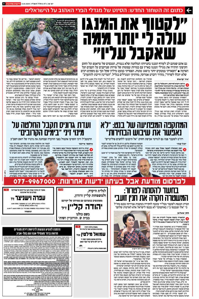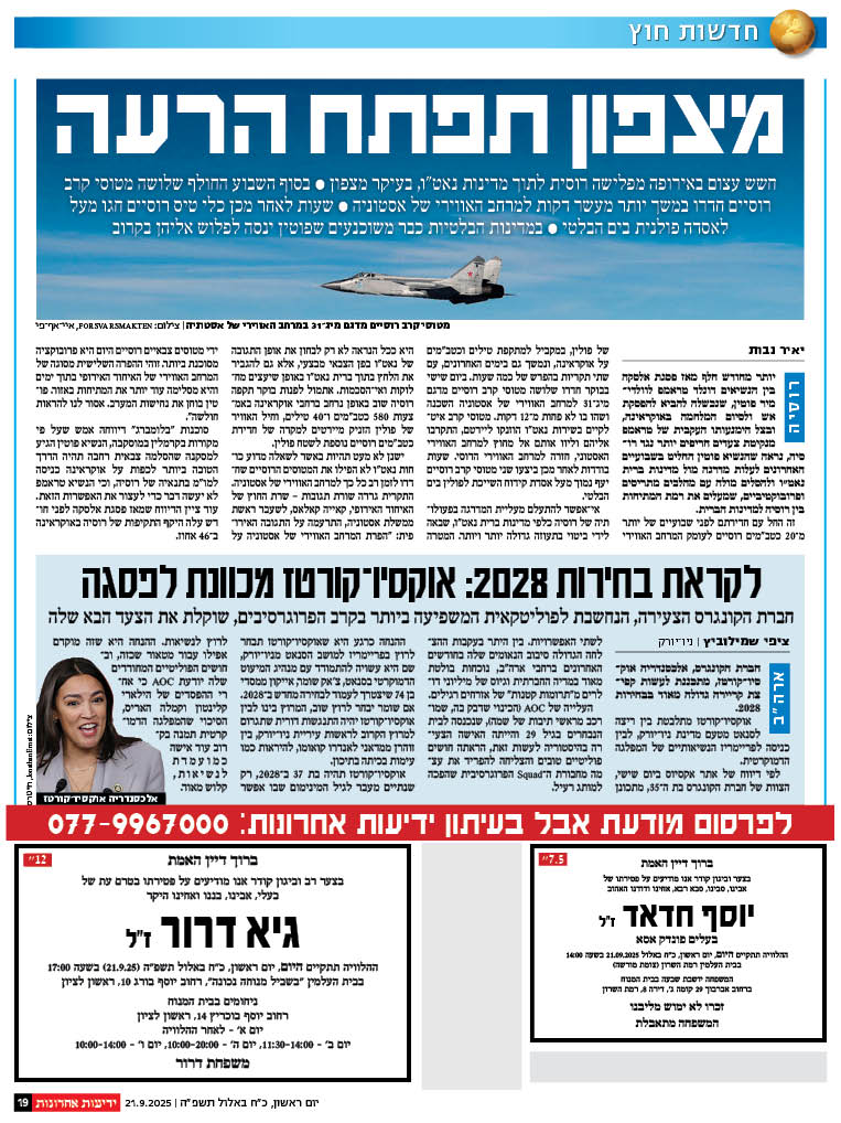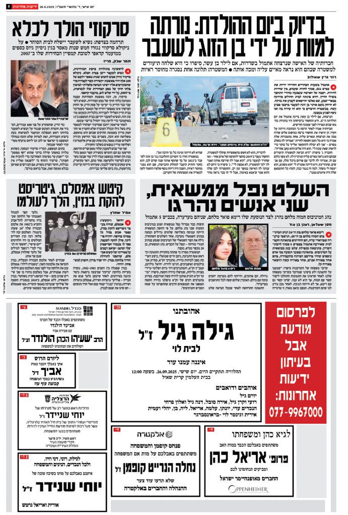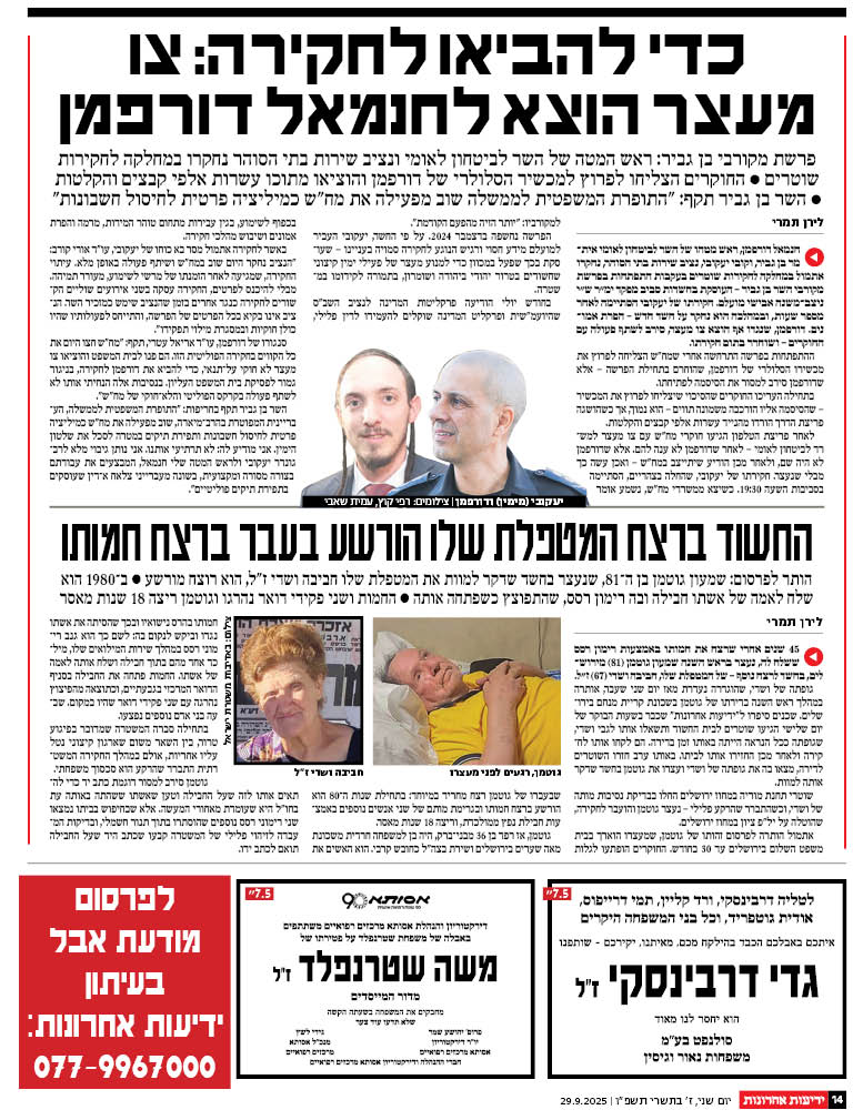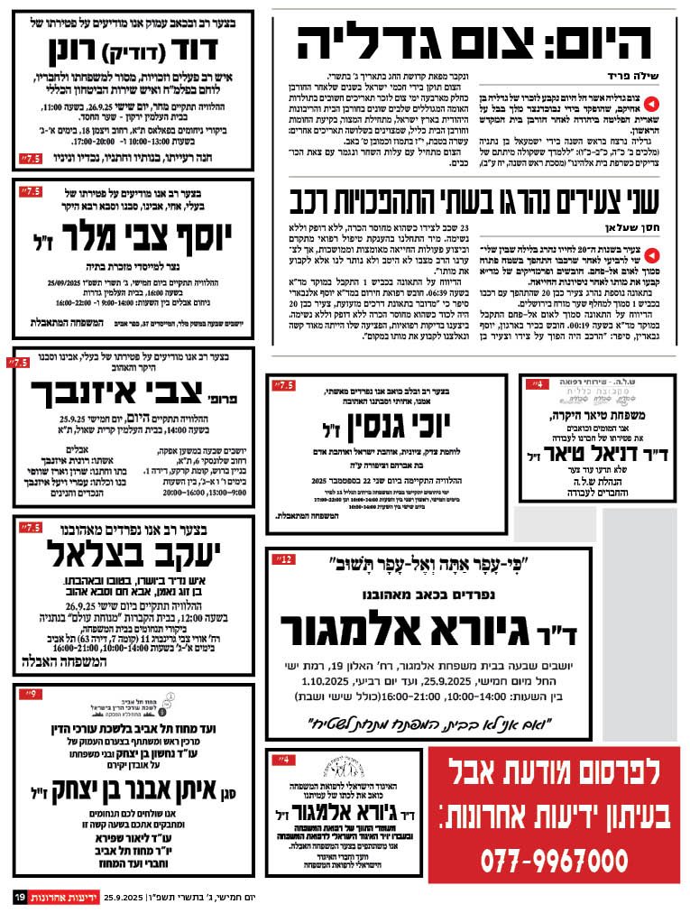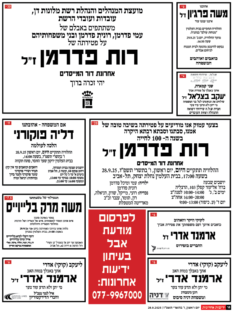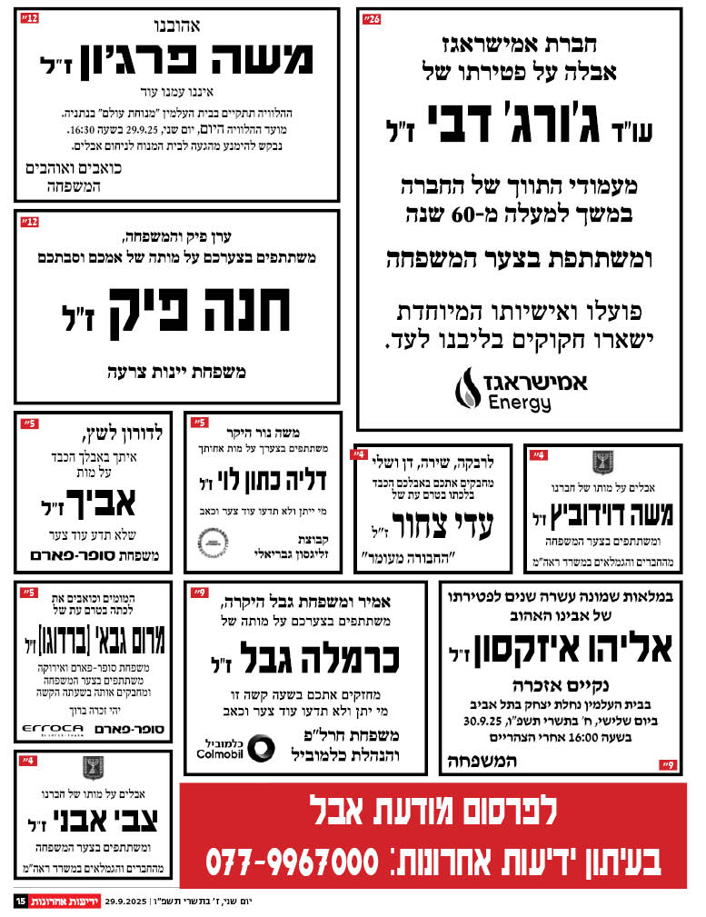 לפרסום מודעות אבל בעיתון ידיעות אחרונות חייגו 077-9967000