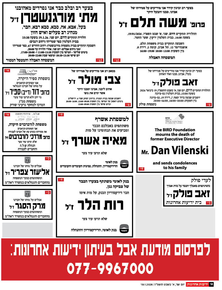 לפרסום מודעות אבל בעיתון ידיעות אחרונות חייגו 077-9967000