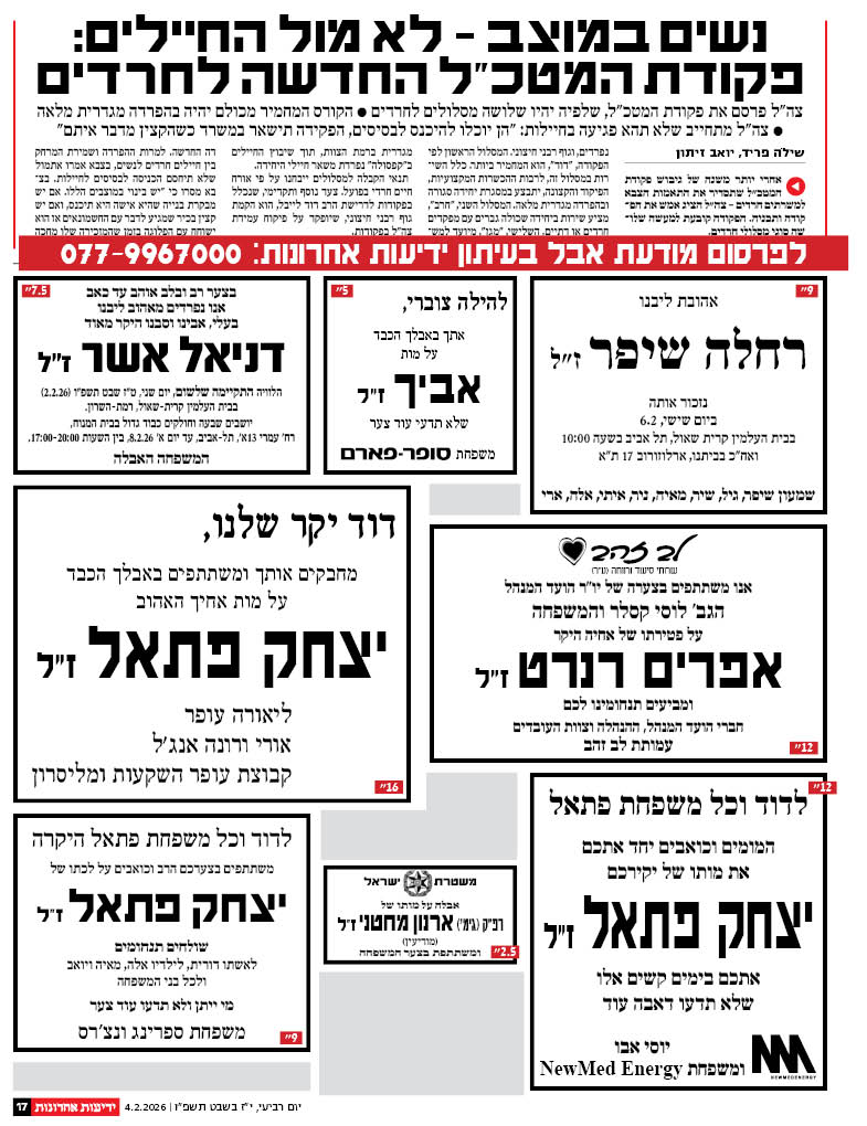ההלוויה תתקיים היום, יום רביעי 4.2.26,