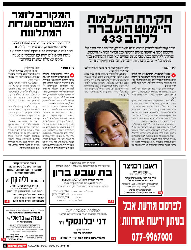 ההלוויה תתקיים ביום חמישי, 18.12.2025