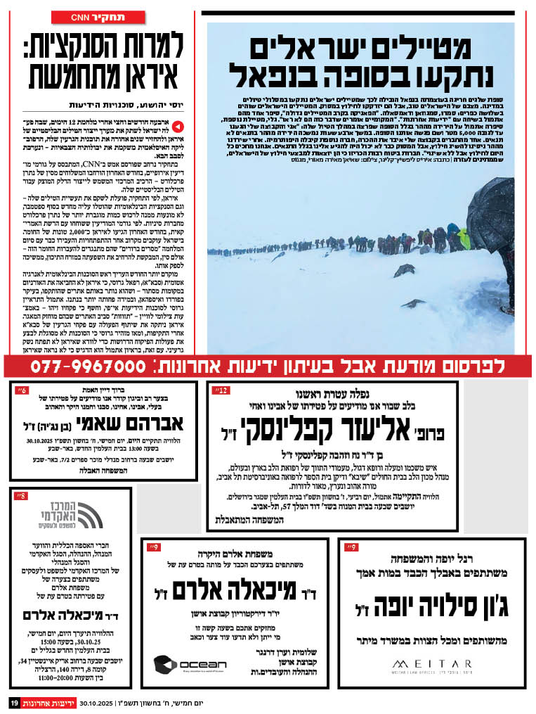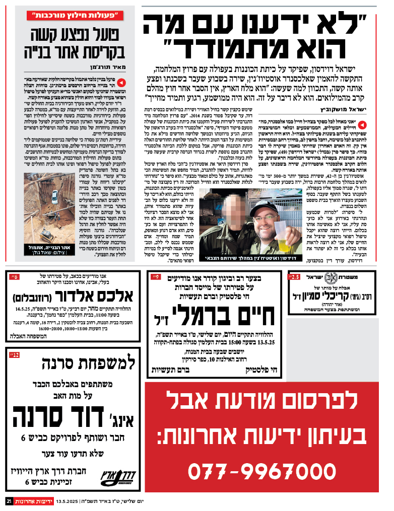 לפרסום מודעות אבל בעיתון ידיעות אחרונות חייגו 077-9967000