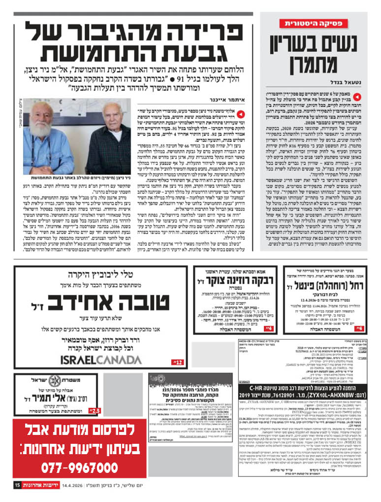 לפרסום מודעות אבל בעיתון ידיעות אחרונות חייגו 077-9967000
