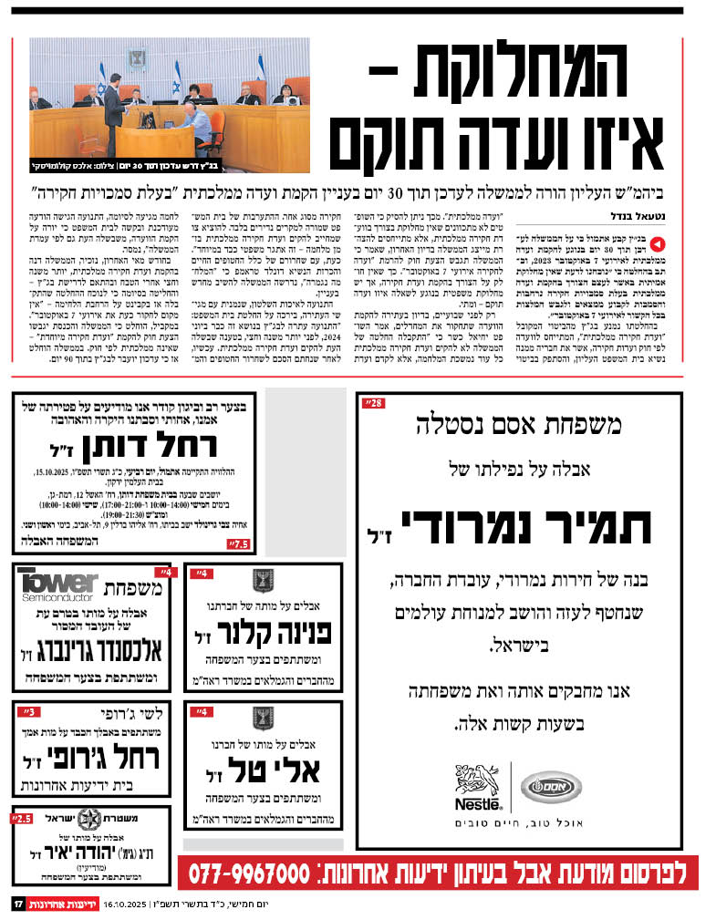 לפרסום מודעות אבל בעיתון ידיעות אחרונות חייגו 077-9967000